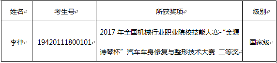 根据鄂教职成[2018]3号文件规定,凡获得省级及以上职业院校技能大赛三等奖及以上奖项,或具有高级工及以上职业资格、或获得县级以上劳动模范(含同等荣誉)称号,或在服役期间荣立三等功及以上的退役士兵,可直接向学校提出申请,免试录取。经beat365单独招生领导小组办公室研究决定对李律同学参加beat3652019年单独招生考试的免试资格予以公示,公示时间为2019年3月5日-2019年3月11日,公示期内如有异议,请拨打电话027-87378091。