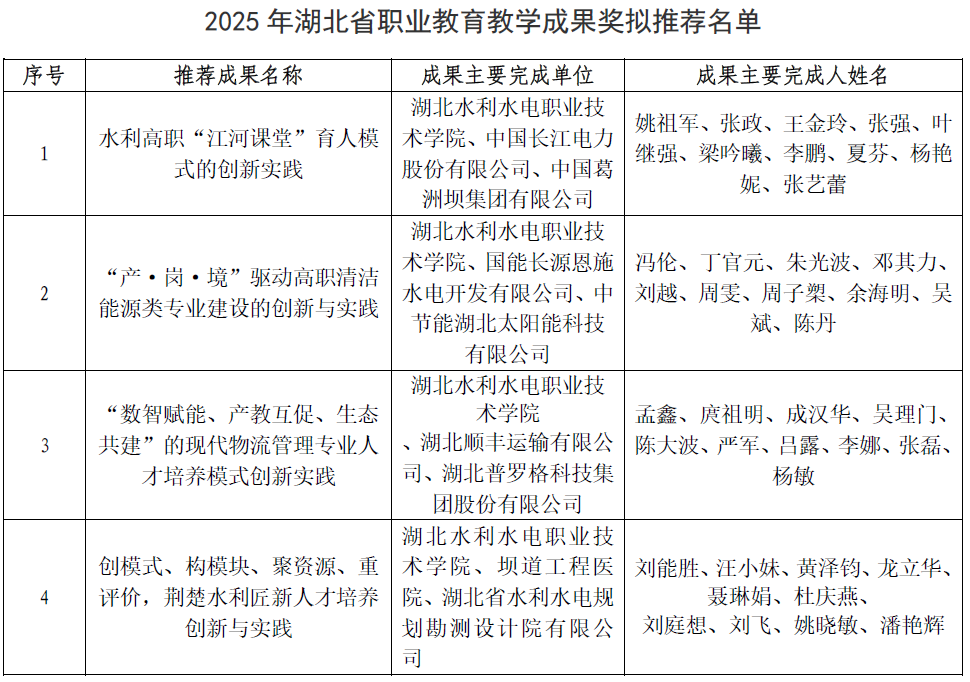 根据《省人力资源和社会保障厅、省教育厅关于开展2025年湖北省教学成果奖评奖工作的通知》(鄂人社奖〔2025〕50号)文件精神,经教师申报、学院推荐、部门审核、专家评审、学院审定,拟推荐4项成果参加湖北省高等职业教育教学成果奖评选。现将拟推荐申报成果基本信息予以公示,具体名单附后。