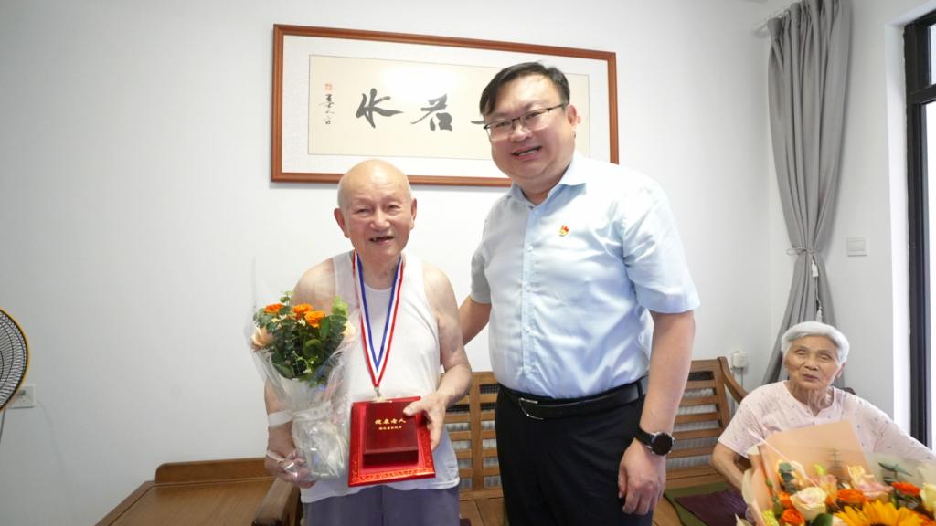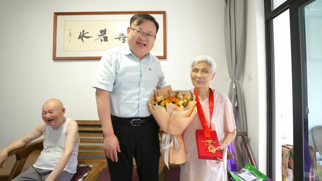 王玉才详细询问了他们的生活情况和健康状况,并致以节日问候与诚挚祝福,感谢他们长期以来为党的事业作出的重要贡献,希望老党员们能继续发挥榜样作用,一如既往支持学院改革发展,多提宝贵意见。随后,王玉才为敖水莲同志颁发了“光荣在党50年”纪念章并送上鲜花,对其为学院高质量发展贡献智慧和力量给予充分肯定。同时为其老伴杨润生同志颁发了省水利厅第九届“健康老人”奖章、荣誉证并送上鲜花和礼品,对其践行健康文明生活方式和保持良好精神风貌给予了高度赞扬。