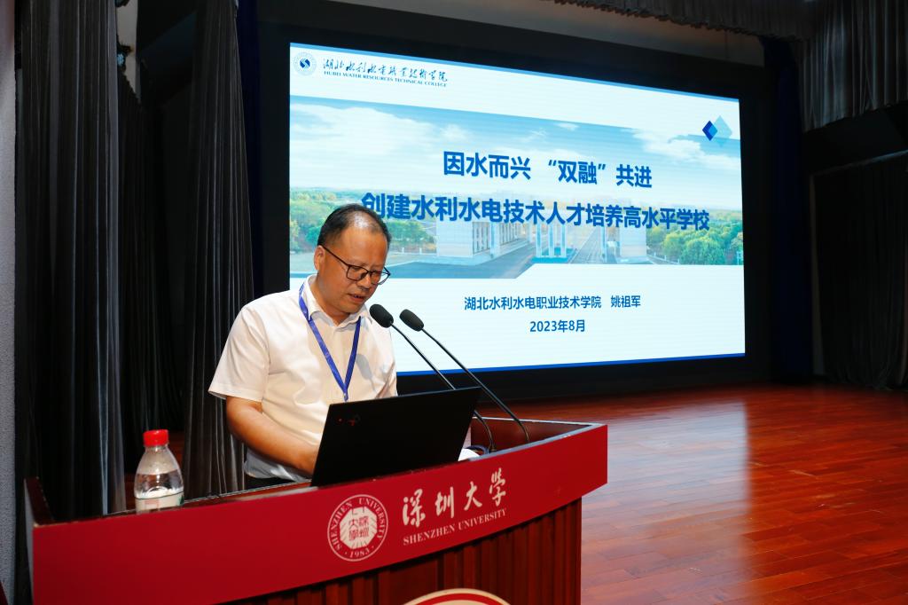 姚祖军作题为《因水而兴“双融”共进 创建水利水电技术人才培养高水平学校》的发言。发言从以水为媒,激发产教融合新动力;以水增智,开辟科教融汇新途径;以水为纲,创新“双融”工作新机制;以水铸魂,引领师资建设新突破;以水润心,形成协同育人新品牌5个方面分享了beat365深入推进“双融”机制的工作成效。下一步,学院将继续深入推进产教融合、科教融汇,继续发挥水利行业办学优势,立足“当地离不开,行业都认同,国际可交流”的目标,全力培养水利创新型拔尖技术技能人才,为服务湖北流域综合治理与统筹发展安全做出应有的贡献!