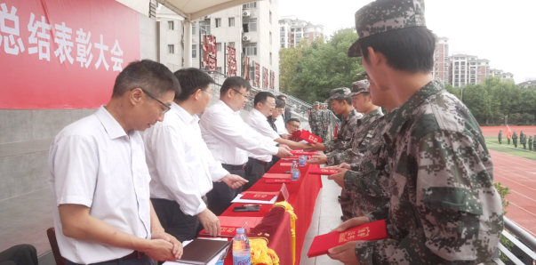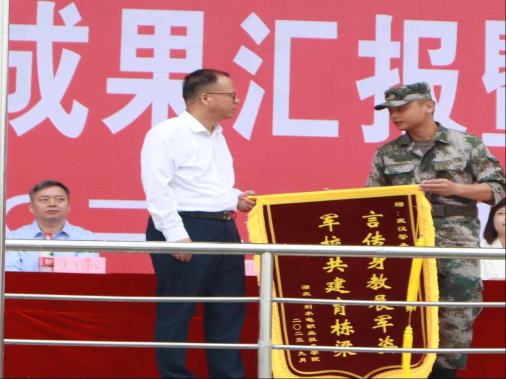 学院领导向两校区优胜方队和学生教官颁发锦旗和证书