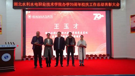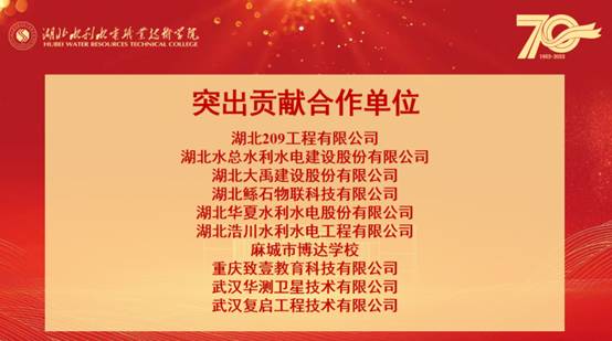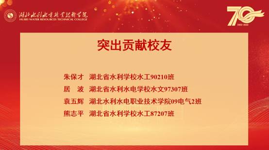突出贡献合作单位代表、武汉复启工程技术有限公司210班校友黄彦林在交流发言时表示作为水院的毕业生,对母校成功举办办学70周年校庆感到十分自豪,校庆系列活动的成功举办在社会上产生了极大反响,今后将继续秉承“修身明志 励学求真”的校训精神,回报母校、回报社会。