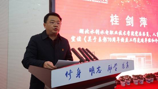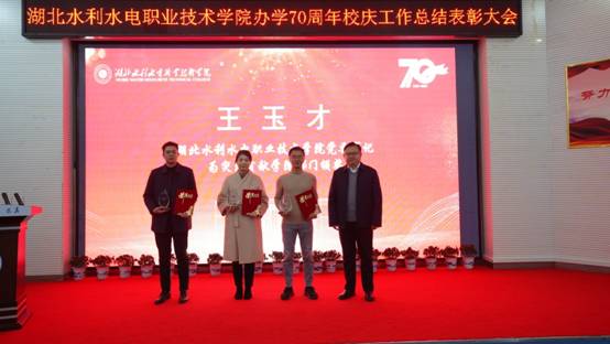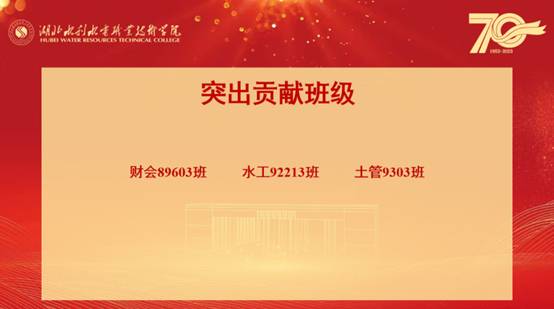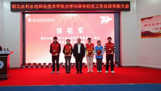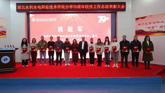 党委委员、人事处处长桂剑萍宣读《关于表彰70周年校庆工作先进单位和个人的决定》,湖北209工程有限公司等10家单位获“突出贡献合作单位”奖,院办公室(校友会)等3个部门获“突出贡献部门”奖,教务处等7个部门获“先进集体”奖,财会89603班等3个校友班级获“突出贡献班级”奖,朱保才等4位校友获“突出贡献校友”奖,庹祖明等3名个人获“突出贡献职工”奖,陈子尚等78名个人获“先进个人”奖,房子群等181名同学获“优秀志愿者”奖。