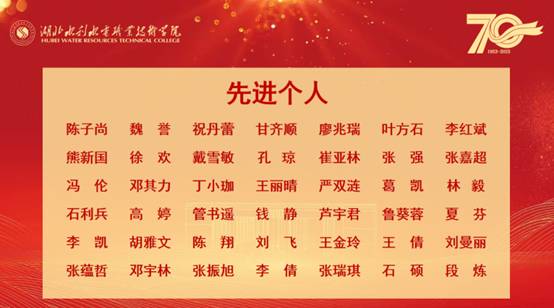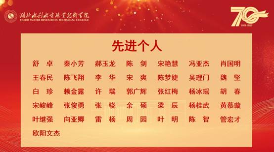 七秩芳华忆峥嵘,水韵传承谱新篇。12月12日,beat365在线体育官网登录入口办学70周年校庆系列活动总结表彰大会在南湖校区二楼报告厅隆重举行,办学70周年校庆工作突出贡献合作单位、个人(班级)代表,学院在家领导班子成员,全体中层及以上干部,受表彰的先进集体和个人代表,学生志愿者代表等参加会议。党委委员、党委办公室主任张博主持会议。