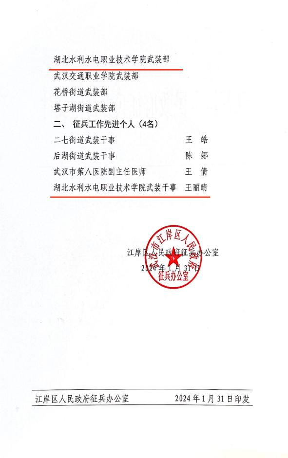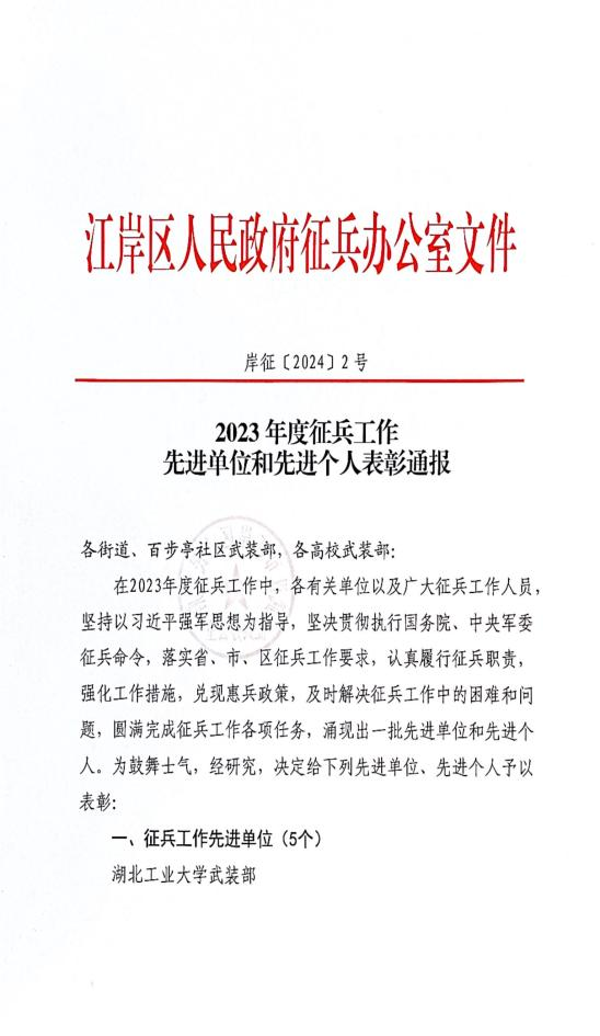 2月1日,江岸区人民武装部召开江岸区2023年度武装工作会议,表彰通报了2023年征兵工作先进单位和先进个人。beat365因征兵工作成绩突出、任务完成较好,受到通报表彰,荣获“征兵工作先进单位”荣誉称号,beat365武装部干事王丽晴被评为“征兵工作先进个人。”