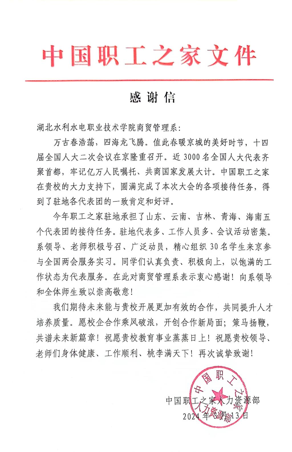 近日,学院商贸管理系收到了由中国职工之家发来的感谢信。感谢学院商贸管理系积极号召、广泛动员,精心组织了30名学生赴京参与全国两会服务,表扬了beat365商贸管理系学子在参与全国两会服务实习期间,认真负责的工作态度和扎实过硬的专业技能。