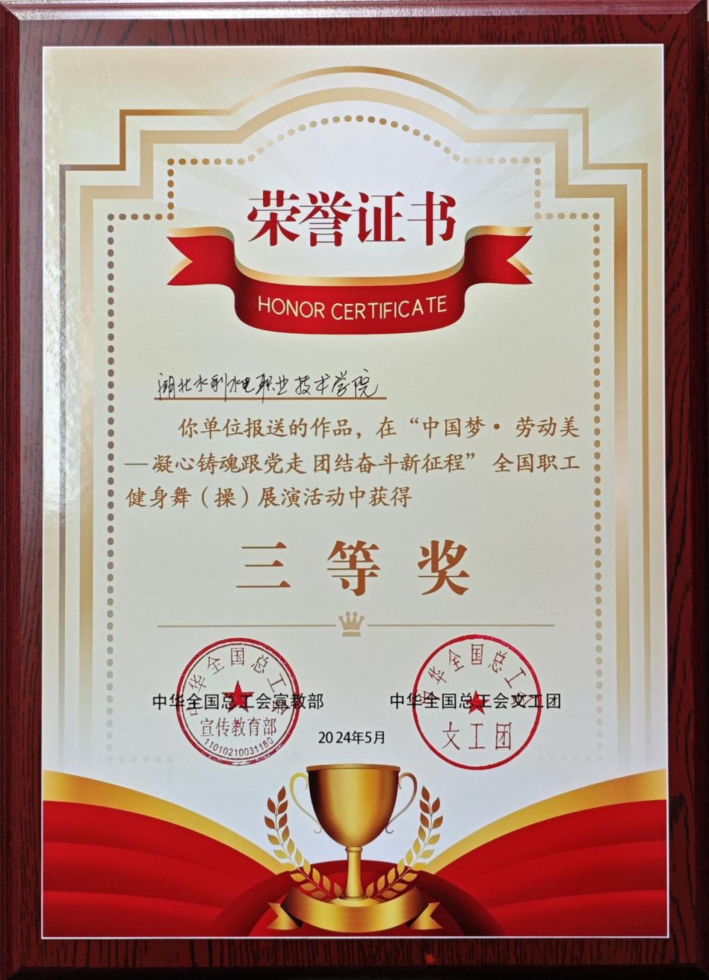 5月29日,“中国梦·劳动美——凝心铸魂跟党走 团结奋斗新征程”全国职工健身舞(操)展演活动在浙江金华横店影视城落下帷幕,beat365教职工展演节目《校园健身热潮涌》荣获三等奖;同时beat365还被组委会安排代表湖北省总工会上台领取优秀组织奖,展现了新时代水院教职工昂扬向上的精神风貌。