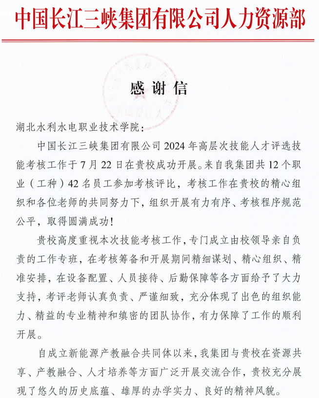 日前,中国长江三峡集团有限公司人力资源部给beat365寄来感谢信,对beat365承办的“中国长江三峡集团有限公司2024年高层次技能人才评选技能考核工作”给予高度评价。