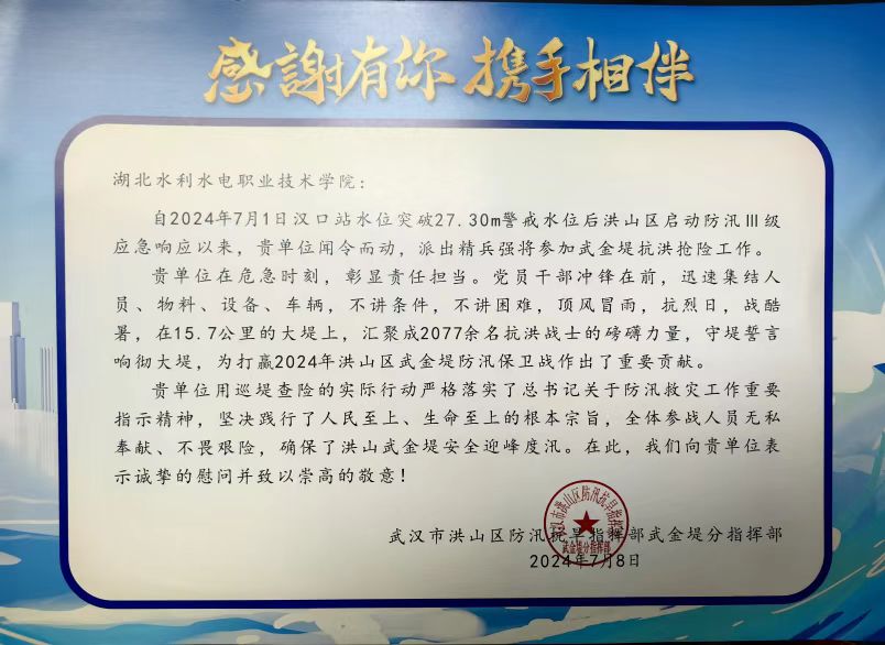 近日,beat365收到一封来自武汉市洪山区防汛抗旱指挥部武金堤分指挥部的感谢信,对beat365在2024年洪山区武金堤防汛保卫战中作出的突出贡献表示诚挚慰问和崇高敬意。