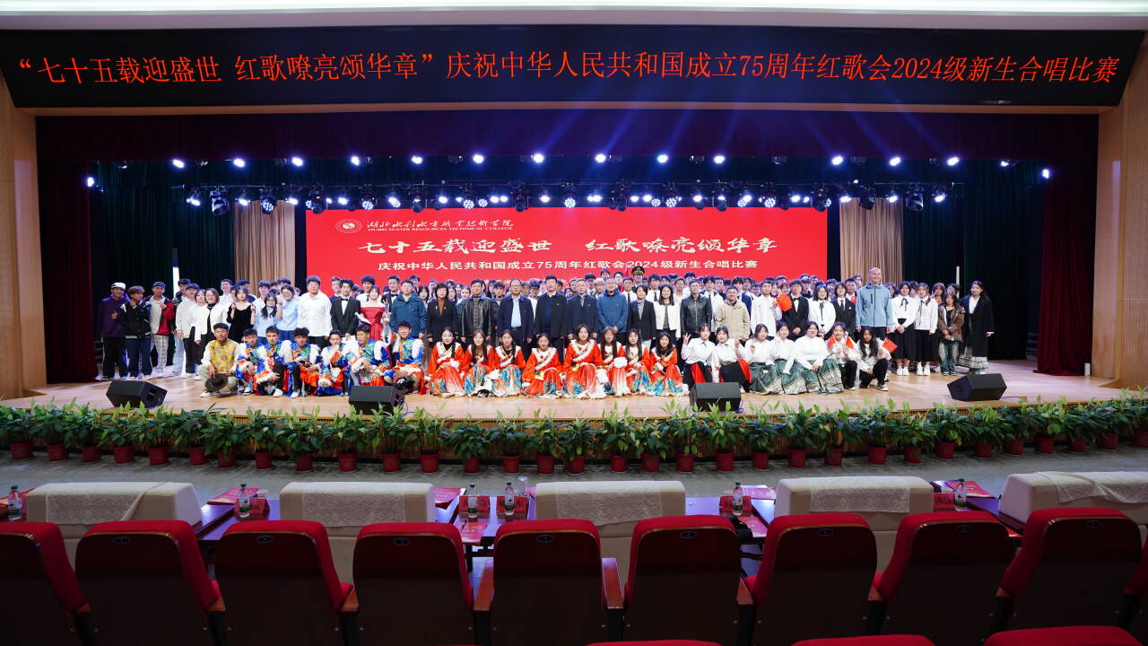 为庆祝中华人民共和国成立七十五周年,高亢唱响爱国主旋律,深情颂扬新中国成立七十五载的光辉历程与伟大成就,11月21日下午,“七十五载迎盛世 红歌嘹亮颂华章”庆祝中华人民共和国成立75周年红歌会2024级新生合唱比赛在学院汤逊湖校区大学生活动中心报告厅隆重举行。学院党委副书记、院长姚祖军出席活动并讲话。