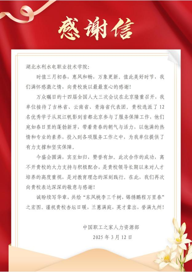 3月12日,学院收到来自中国职工之家的感谢信。信中对学院选派优秀学生参与十四届全国人大三次会议服务保障工作给以高度评价,赞扬12名同学在服务期间展现出的高度责任感、专业素养和团队合作精神。