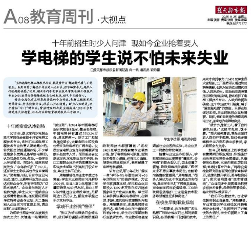 △2025年11月25日,《楚天都市报》以《十年前招生时少人问津 现如今企业抢着要人——学电梯的学生说不怕未来失业》为题