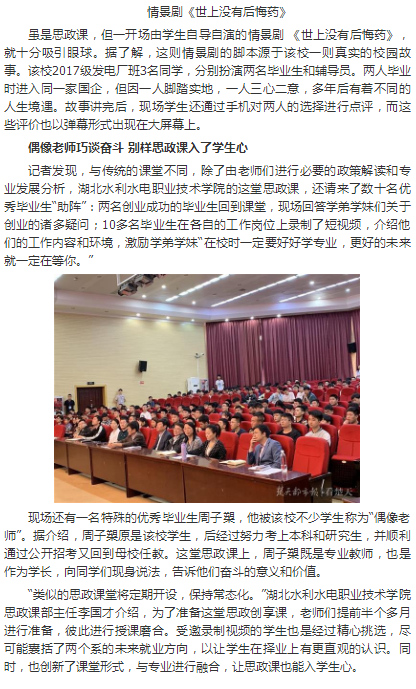 虽是思政课,但一开场由学生自导自演的情景剧 《世上没有后悔药》,就十分吸引眼球。据了解,这则情景剧的脚本源于该校一则真实的校园故事。该校2017级发电厂班3名同学,分别扮演两名毕业生和辅导员。两人毕业时进入同一家国企,但因一人脚踏实地,一人三心二意,多年后有着不同的人生境遇。故事讲完后,现场学生还通过手机对两人的选择进行点评,而这些评价也以弹幕形式出现在大屏幕上。