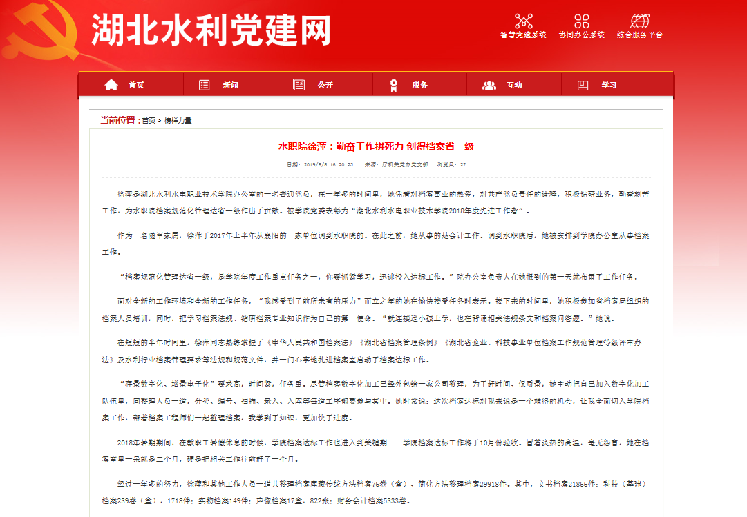 (范黎来)近日,湖北水利党建网“榜样力量”刊发文章《水职院徐萍:勤奋工作拼死力创得档案省一级》,报道beat365办公室档案员徐萍同志的事迹。据悉,徐萍同志为湖北水利党建网“榜样力量”栏目今年推出的第一人。