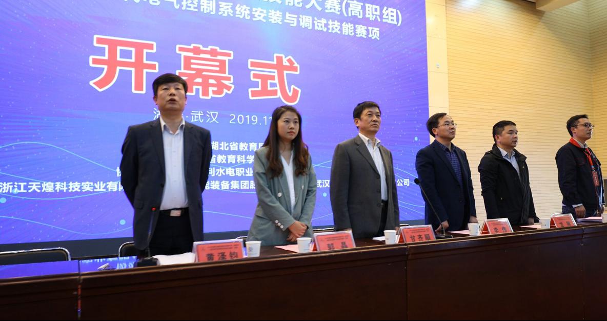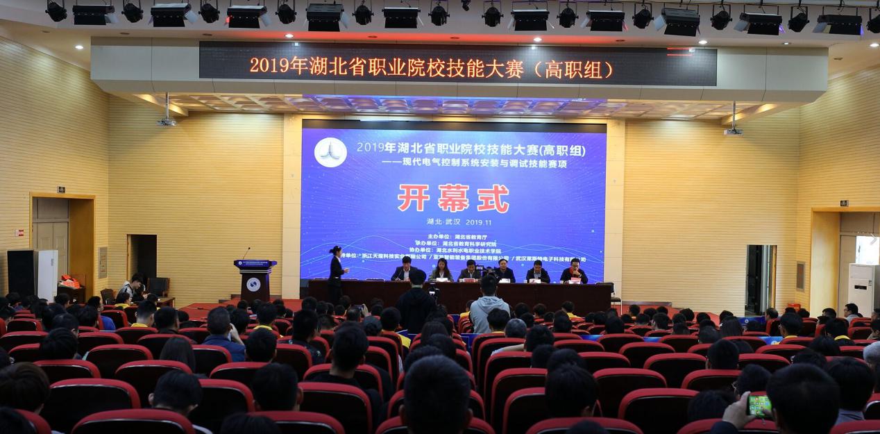 (成汉华)11月5日下午,天高云淡,秋风习习,2019年湖北省职业院校技能大赛(高职组)现代电气控制系统安装与调试赛项开幕式在beat365汤逊湖校区学术报告厅隆重举行。赛项仲裁长、湖北省教育厅郭晶主任,赛项裁判长、武汉铁路职业技术学院李伟教授,赛项仲裁长、湖北生物科技职业学院龙翔教授,学院党委书记甘齐顺,赛项执委会副主任、学院党委委员、副院长黄泽钧,赛项副裁判长、学院电子电力工程系电气专业负责人朱光波老师,以及来自全省36所高职院校的领队、指导老师、参赛选手、候选裁判和志愿者们参加了开幕式。
