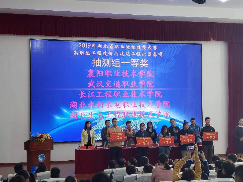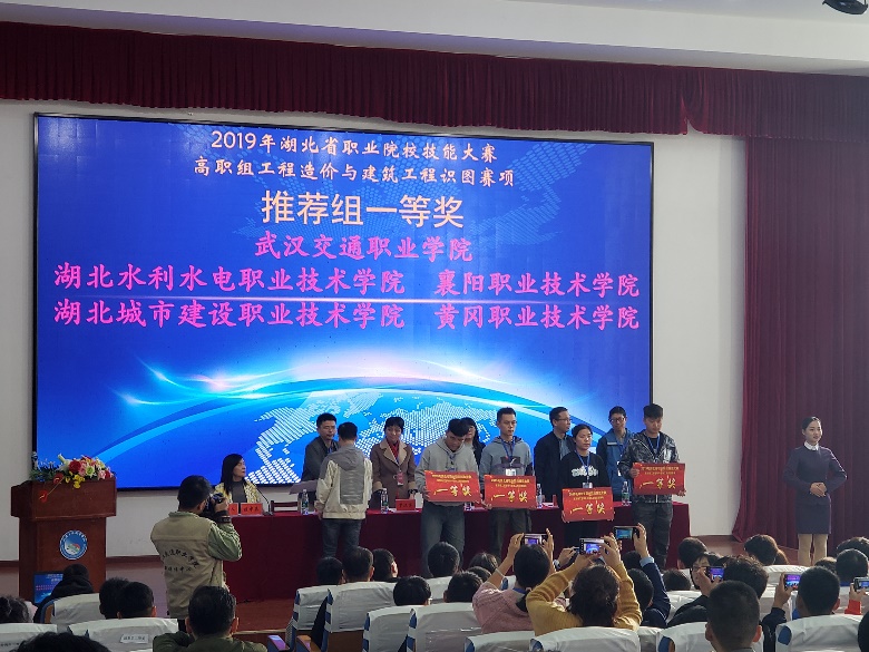 (余丹丹)11月15日,2019年湖北省职业院校技能大赛(高职组)工程造价与建筑工程识图赛项圆满落幕。beat365建筑工程系2017级造价专业和建工专业学生刘瑜锋,倪萌,乔璐,杨啸天4人组成的推荐队和李美、龙凯、禇雪娇、吕宙4人组成的抽测队在高职组工程造价与建筑工程识图赛项中,均获团体一等奖。