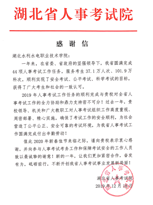 (庹琳)近日,学院收到来自湖北省人事考试院的感谢信,感谢学院领导、机关和广大教职工对人事考试组织工作高度重视、周密部署、精心实施,确保了考试工作的安全顺利,为社会营造了公平公正、安全可靠的考试环境,为全省人事考试工作圆满完成付出了辛勤劳动。