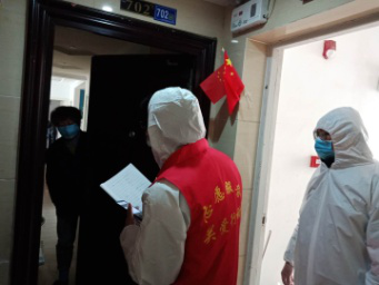 (先锋队员测量社区居民体温、询问生活困难及需求)