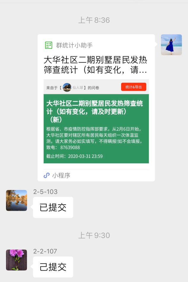 党员庞璐同志,于2月17日就到所在的大华社区报到登记。她利用自己的专业优势,协助社区在前期建群的基础上开展网格化管理。指导志愿者完成测温小程序开展每天体温检测的统计,为社区抗疫工作提供智力支持。指导完成52户88人每日的信息排查,协助社区志愿者推进规范日登记工作。庞璐同志还坚持全程网上办公,适时进行网络小结点评,为片区的规范管理贡献了智慧和力量。