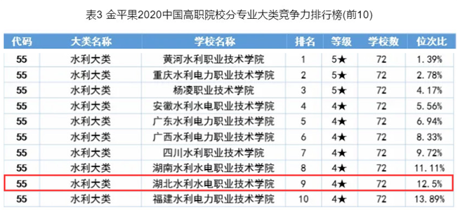 (成汉华)近期,2020年中国高职院校竞争力排行榜发布,其中首次发布高职专业评价榜,对全国1429所高职院校19个专业大类、99个专业类和731个专科专业的总体实力进行了评价和分析。本次评价为助力“双高”建设,由原来单一的学校综合评价向深层次、多维度的专业领域评价扩展,涵盖了专业大类、专业类和专业三大方面。在高职分专业大类竞争力排行榜中,beat365水利大类中位列全国第九;在高职分专业类竞争力排行榜中,beat365水利水电设备类位列全国第一;在高职分专业竞争力排行榜中,beat365风力发电工程技术专业、电梯工程技术专业均位列全国第三。