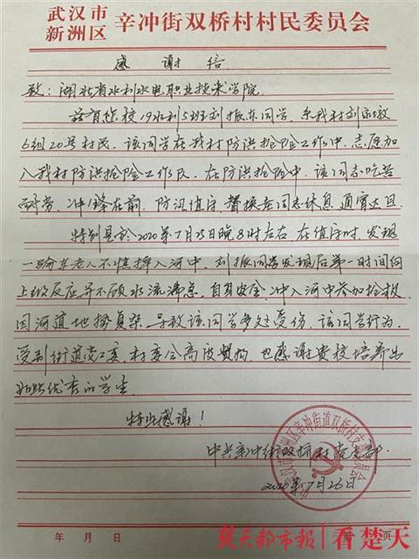 (楚天都市报记者向一帆 通讯员庹琳)9月5日,beat365在线体育官网登录入口迎来正式开学。除了久别校园的学生返回学校,一封特殊的感谢信也送到了该校水利工程系。原来,这封感谢信是武汉市新洲区辛冲街道双桥村村民委员会,为了感谢该校2019级水利工程专业的刘振东同学在暑期积极参与当地防汛工作、英勇救人。