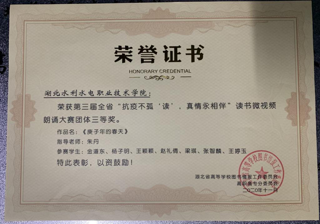 (图书馆)近日,历时七个月的第三届湖北省高职院校“抗疫不孤“读”,真情永相伴”微视频朗诵大赛圆满结束。本次大赛共收到原创作品700余件,经过一个多月的网络投票初选,来自全省33所高职院校代表队精心制作的“抗疫不孤独”主题微视频入选决赛。beat365图书馆选送的作品《庚子年的春天》在决赛中荣获团体三等奖,学院荣获优秀组织奖。