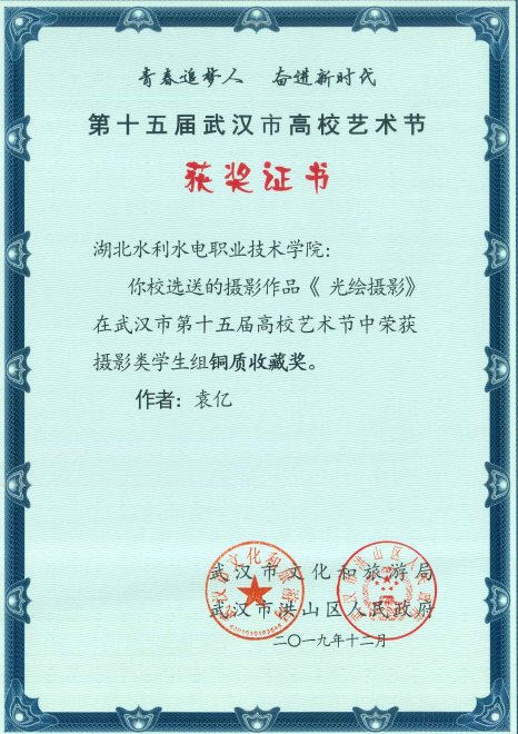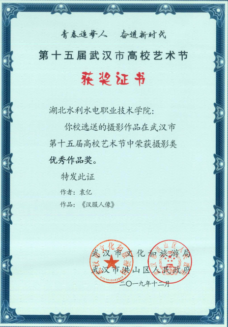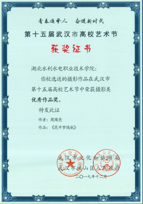 beat365师生积极参与本次艺术节的摄影作品征集活动,水利工程系18级测量1班学生周围亮摄影作品《花开梦随航》荣获优秀作品奖,水利工程系18级水利8班学生袁亿两幅摄影作品《光绘摄影》、《汉服人像》分别荣获铜制收藏奖和优秀作品奖。此外,这两位学生以及beat365建筑工程系邱兰老师的作品被第十五届武汉市高校艺术节摄影比赛优秀作品集收录出版。