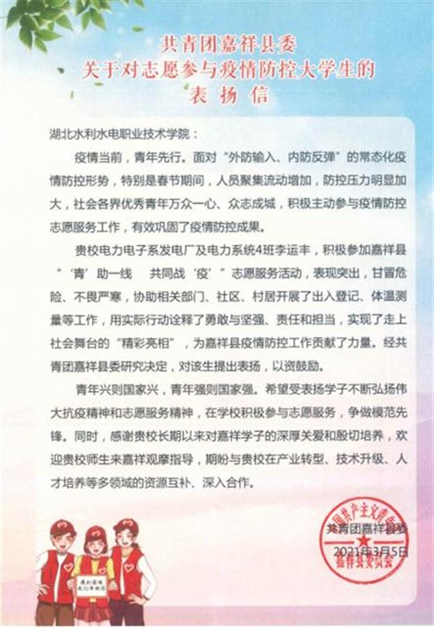 “疫情当前,青年先行。贵校学生李运丰积极参加志愿服务活动,表现突出。经共青团嘉祥县委研究决定,对该生提出表扬,以资鼓励。”近日,湖北水利水电学院团委收到一封来自共青团嘉祥县委的表扬信,信中对该校电力电子系发电厂集电力系统4班李运丰同学今年寒假期间,甘冒风险协助相关部门、社区、村落展开了出入登记、体温测量等志愿服务的事迹表示感谢。