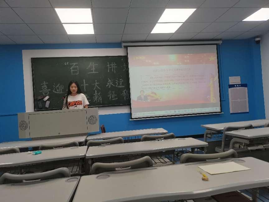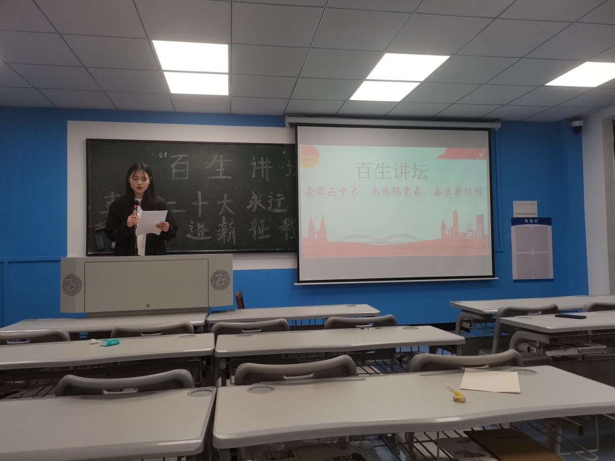 (欧阳文杰)4月25日晚,商贸管理系在南湖校区举行了以“喜迎二十大,永远跟党走,奋进新征程”为主题的“百生讲坛·优秀主讲人”比赛,商贸管理系相关负责人出席了本次比赛活动。