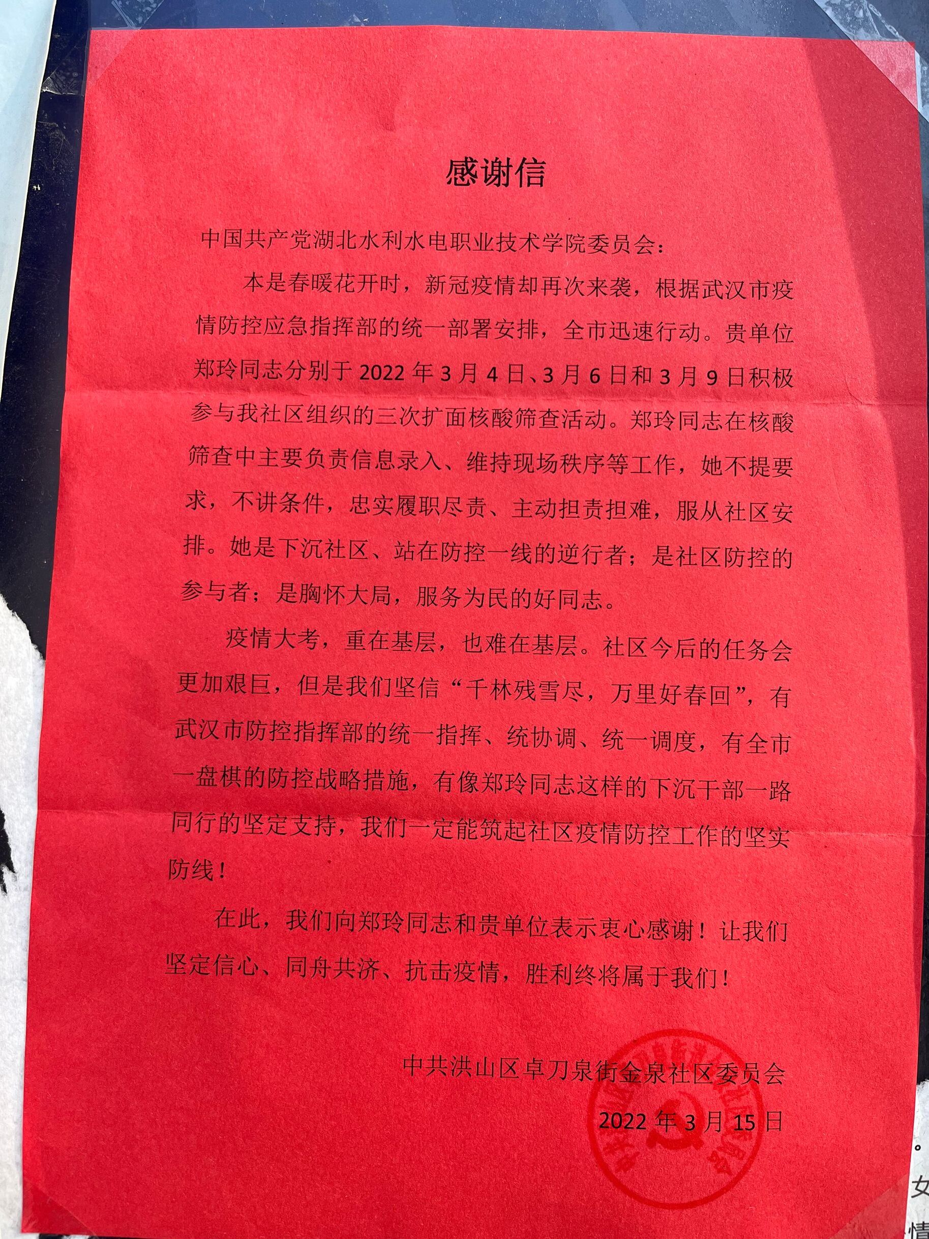 (水利工程系)近日,学院收到了一封来自洪山区卓刀泉街金泉社区委员会的感谢信。信中指出beat365水利工程系水工党支部下沉党员郑玲在社区疫情防控中不提要求、不讲条件,忠实履职尽责、主动担责担难,服从社区安排,对郑玲同志的表现给出了高度的肯定与感谢。