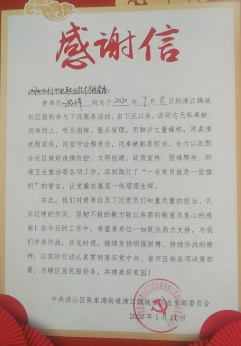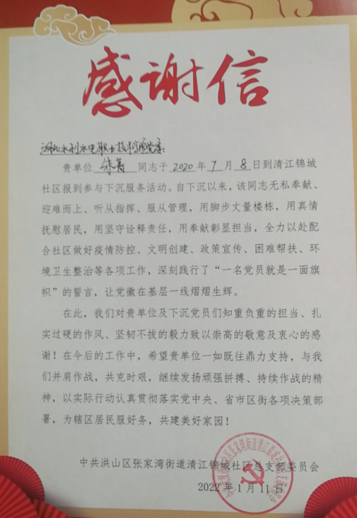 (邵元纯)1月12日,学院收到了两封来自洪山区张家湾街道清江锦城社区党总支的感谢信。信中表扬beat365建筑工程系第二党支部下沉党员沈小芹和朱菁两位同志助力社区抗疫,为该社区疫情防控、文明创建、政策宣传、困难帮扶、环境卫生整治等各项工作做出了重要贡献,特此向beat365表示衷心感谢,并向beat365全体下沉党员知重负重的担当、扎实过硬的作风、坚韧不拔的毅力致以崇高的敬意及衷心的感谢!