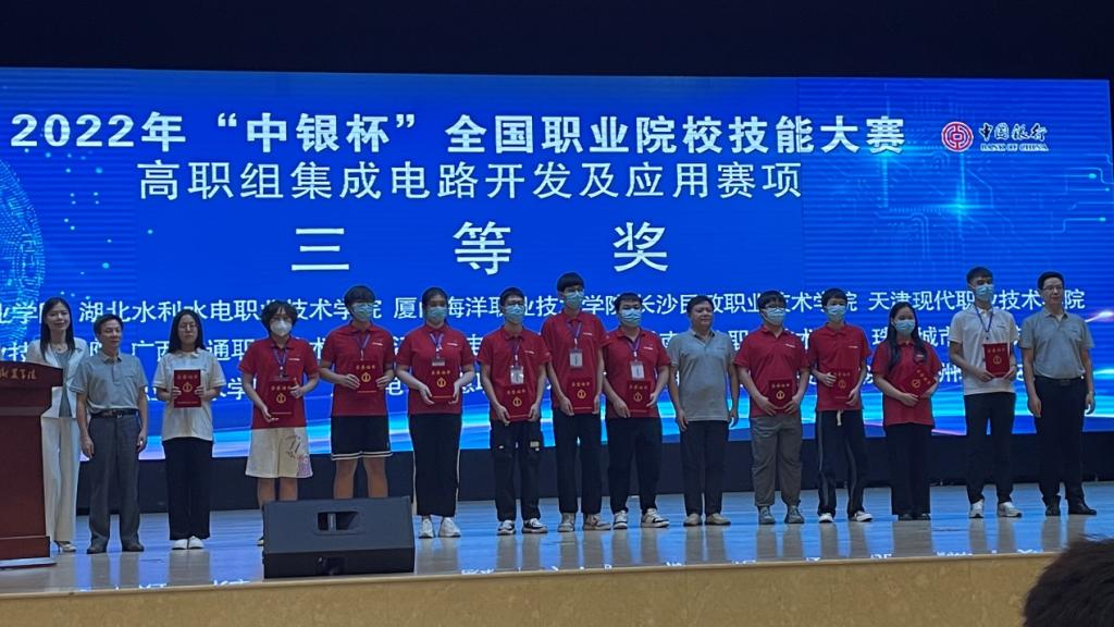 (邓其力 刘越)8月29日至8月31日,2022年全国职业院校技能大赛 “集成电路开发及应用”赛项(高职组)在山东滨州职业学院开赛。beat365由张国汉、刘越老师指导,刘铭志、柯康、夏志勇同学组成的参赛团队在该赛项中荣获三等奖。