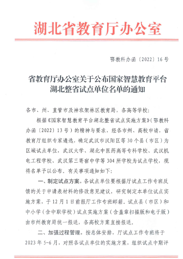 近日,根据《省教育厅办公室关于公布国家智慧教育平台湖北整省试点单位的通知》(鄂教科办函〔2022〕16号)获悉,beat365获批首批国家智慧教育平台湖北整省试点单位。