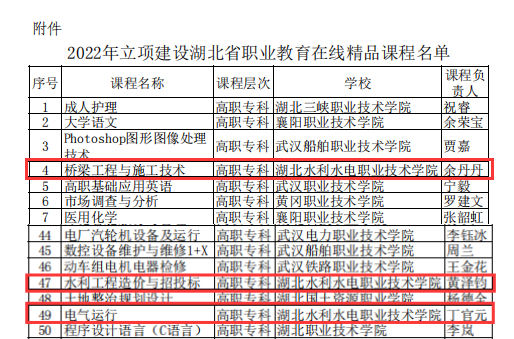 本次入选省级职业教育在线精品课程建设的分别是余丹丹教授主持的《桥梁工程与施工技术》、黄泽钧教授主持的《水利工程造价与招投标》和丁官元教授主持的《电气运行》等3门课程.其中《桥梁工程与施工技术》同时作为国家在线精品开放课程在本次也顺利通过复核。3门课程作为beat365在线精品课程建设的代表,能够很好的适应当前职业教育线上线下教学创新融合新常态,在课程资源建设、课程应用推广以及基于课程特点的教法学法改革上均起到了很好的示范引领作用。