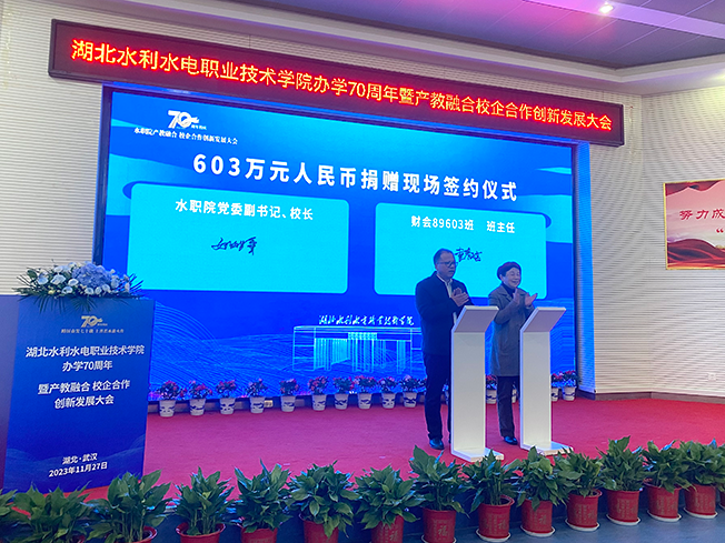 在现金捐赠签约现场,水利厅二级巡视员,原湖北省水利学校财会89603班授课教师邵远亮受校友委托,发表了热情洋溢的讲话,他表达了对学院办学70年来取得重大成就的祝贺以及校友们对学院发展的关心与支持,并说明了财会89603班向学院集体捐赠人民币603万的使用规划。随后,学校党委副书记、院长姚祖军同财会89603班班主任袁春琪老师举行了隆重的捐赠签约仪式。姚祖军还分别与共建产业学院单位、订单班单位、校外实习基地单位签约。