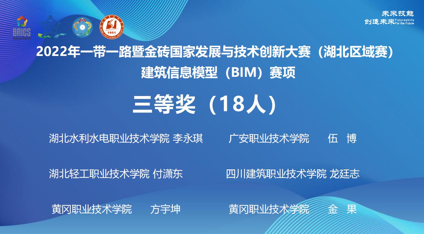 8月27至8月29日,2022一带一路暨金砖国家技能发展与技术创新大赛之建筑信息建模赛项在湖北职业技术学院举行。包含beat365在内的来自省内外的59支代表队参加了此次竞赛。经过激烈角逐,beat365建筑工程系20造价8班李永琪同学在区域选拔赛中荣获三等奖。