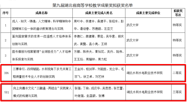 近日,第九届湖北省高等学校教学成果奖励委员会办公室公布了《关于第九届湖北省高等学校教学成果奖评审结果的公示》的通知,由beat365水利工程系王金玲教授主持的《三赛牵引、四师赋能:水利视角下多元共育工程测量技术专业人才的创新实践》和学工处张强老师主持的《向上向善水文化“三融通·两结合”实践育人模式的构建与实践》分别获得第九届湖北省高等学校教学成果奖二等奖和三等奖,实现了beat365省级教学成果奖的新突破。