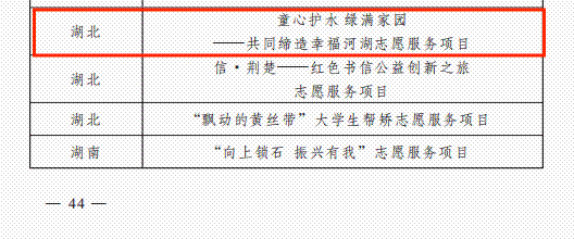本次湖北省“共同缔造·社区计划”专项赛,得到了全省各高校、社区的积极参与,设有美丽小天使、志愿公益市集、智慧助老、残疾人爱心超市等专项项目。学院爱我千湖志愿服务队长期致力于湖北省美丽小天使项目,带领少年儿童,从小关心环境保护事业,用实际行动爱水护水节水,助力改善社区环境,共同缔造美好家园。